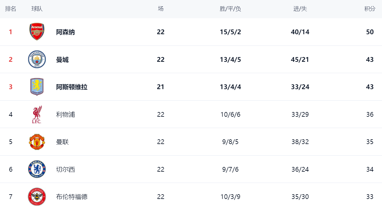 在积分榜上,阿森纳15胜5平2负的战绩,拿到50分,排名榜首位置。曼城连续4轮不胜,丢掉了太多分数,总积分只有43分,屈居第2名,落后了7分。阿斯顿维拉在少赛一场的情况下也是43分,暂时排名第3。利物浦以36分排名第4。曼联总积分达到35分,排名第5,只比利物浦少1分。切尔西34分排名第6。